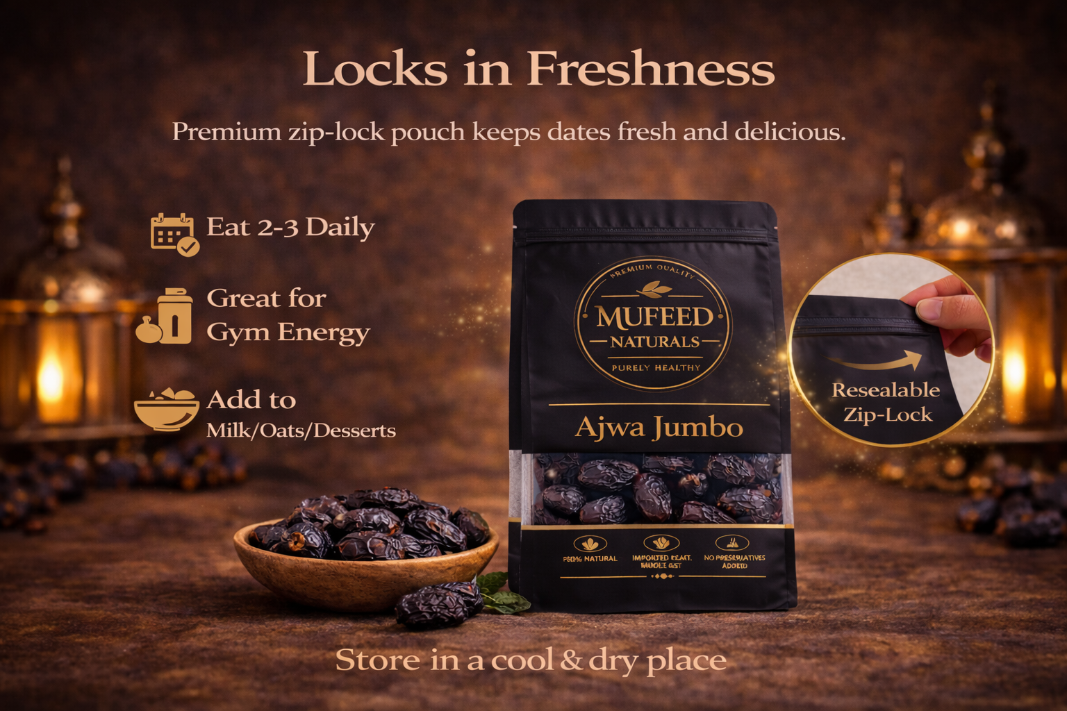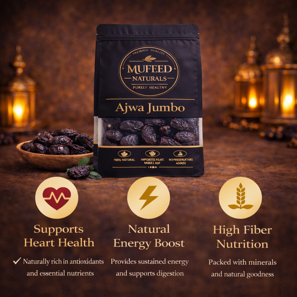 Whether enjoyed as a quick snack, added to smoothies and desserts, or used for traditional occasions, MUFEED Naturals Ajwa Jumbo Dates bring together purity, quality, and taste in every pack.