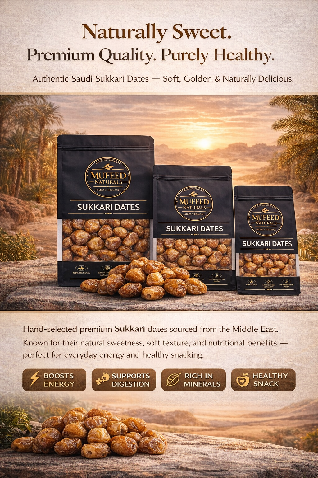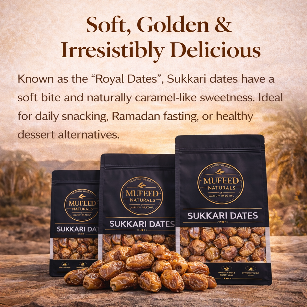 Experience the rich taste of authentic Saudi Sukkari Dates with Mufeed Naturals. Known for their soft texture and naturally caramel-like sweetness, Sukkari dates are one of the most premium varieties loved for their delicious flavor and natural nutritional benefits.