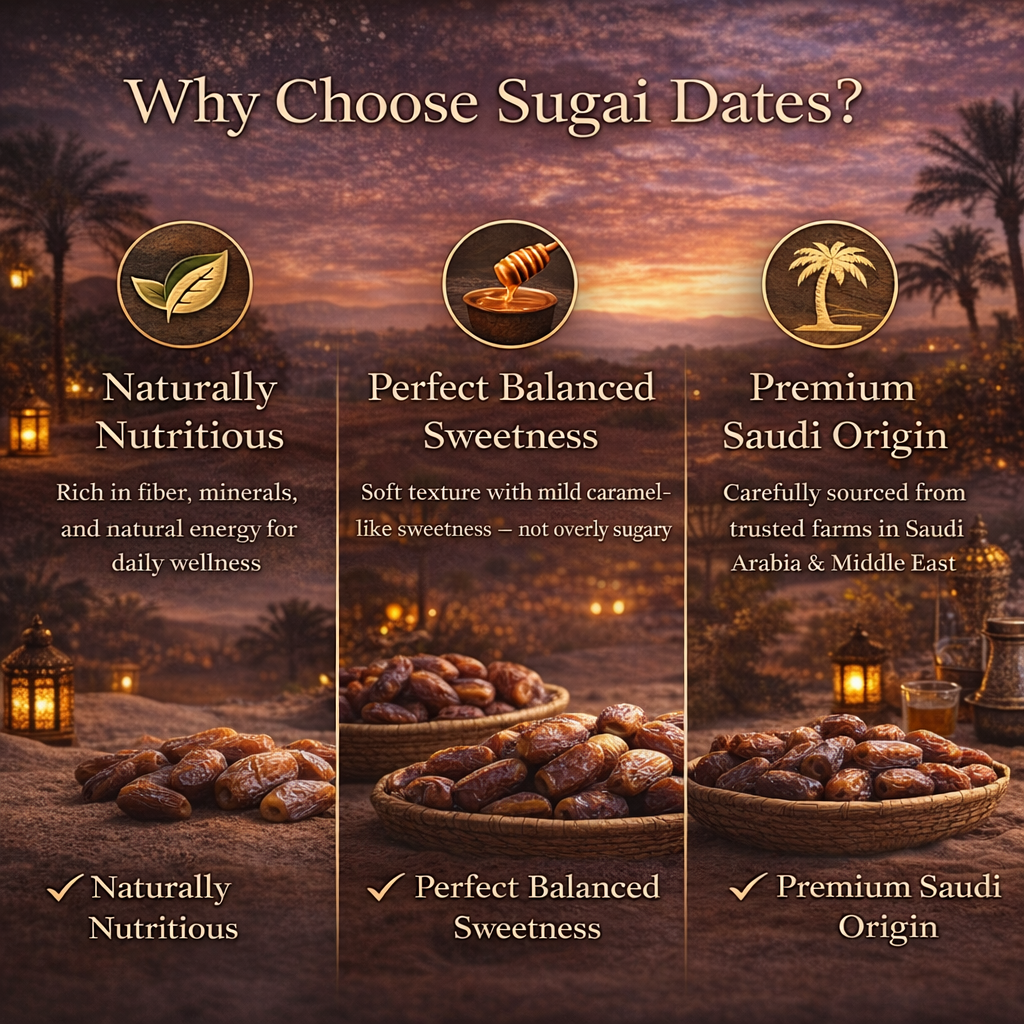 Sugai dates are known for their unique two-tone appearance, soft texture, and naturally balanced sweetness. Carefully sourced from premium Middle Eastern farms, they provide natural energy, essential nutrients, and an authentic taste experience. Ideal for daily snacking, healthy lifestyles, and special occasions, Sugai dates offer a perfect combination of nutrition, quality, and premium flavor.